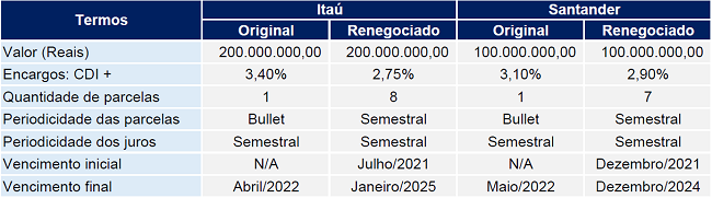 Foram renegociados os contratos de financiamentos firmados junto aos bancos Itaú Unibanco S.A (“Itaú”) e Banco Santander Brasil S.A (“Santander”), com a finalidade de reforço de caixa, como forma de prevenção contra impactos financeiros decorrentes da pandemia do Coronavírus (Covid-19), conforme Fato Relevante divulgado ao mercado em 30 de abril de 2020, passando as operações a terem a estrutura apresentada na tabela abaixo: